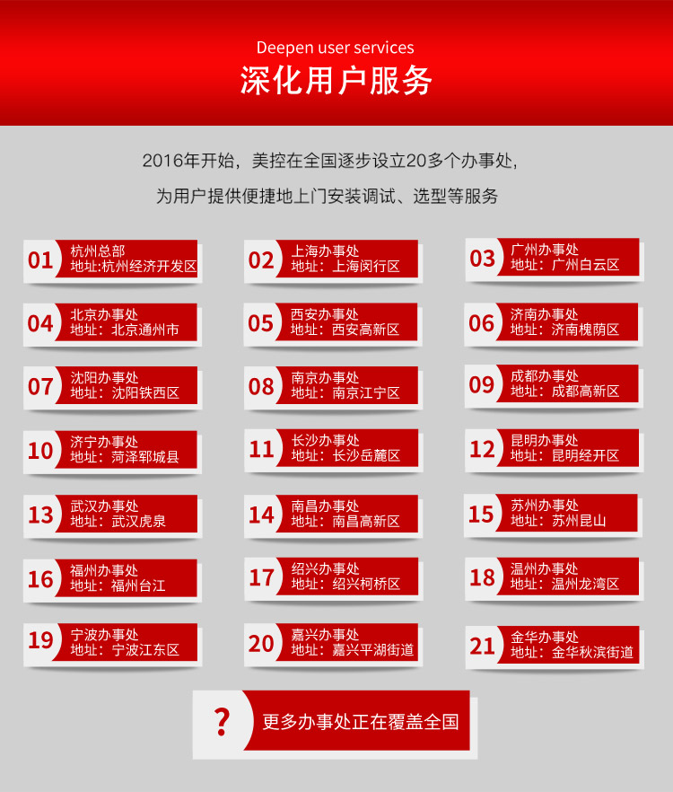 为了服务好每一位新老客户,深入贯彻“以客户为中心”理念,杭州美控已在全国设立了21处办事处。我们将更好的服务带到您的身边,将中国过程自动化解决方案应用到每一位需要我们的用户家中。欢迎您随时联系我们: