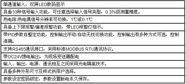 MIK-1300系列模糊PID调节器采用模糊PID算式,傻瓜式操作,0.3级测量精度、7款外尺寸,可支持33种信号输入功能,适用温度、压力、流量、液位、湿度等工业过程量的监测。并配合各种执行器对电加热设备和电磁、电动调节阀进行PID调节和控制。支持2路报警功能,支持1路控制输出或支持采用标准MODBUS协议的RS485通讯接口,1路DC24V馈电,输入端、输出端、电源端光电隔离,100-240V AC/DC或20-29V AC/DC开关电源供电,标准卡入式安装,工作环境温度在0到50℃;且相对湿度5到85%RH无凝结。